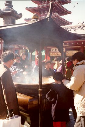 So, the next day another coworker friend (thanks, Kadoyama-san!) took me to Asakusa which has a lot of nice little shops leading to the namesake temple. A couple words about the shrines, they all have water available to wash your hands and most have incense you can breathe deeply. This is so you'll live longer, apparently. I'm not sure if this has anything to do with the incredible amount of cigarettes the Japanese smoke. Strangely, they live a long time. Anyway, when you finally get up to the shrine, you get to clap your hands, toss a few yen in and make a little prayer.