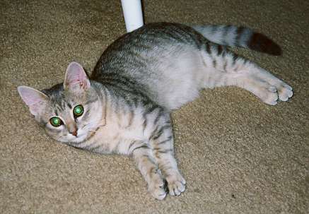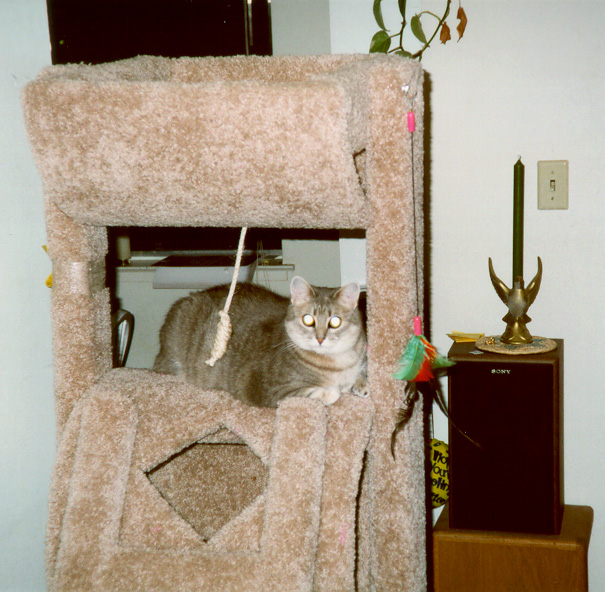 I still remember how I was climibing up the outside stairs to my apartment on the 3rd foor of the Highland Gardens apartments in Mountain view (on Escuela, at the end of Villa) and as I pass the second floor this little kitten jumps off the roof of the laundry kiosk and literally grabs me on the leg and starts meowing.